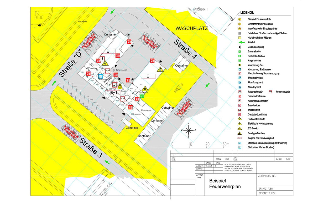 Neben den Flucht- und Rettungsplänen fertigen wir für unsere Geschäftskunden auch Feuerwehrpläne in Form von Übersichtsplänen (Lage- und Aufstellpläne) und die dazugehörenden jeweiligen Geschossgrundrisse nach DIN 14095 an.